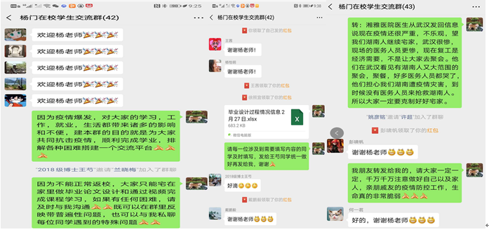 “严”中有“爱”,一直是国际金融团队老师的教育标签。为了共同抗击疫情,帮助在校学生顺利完成学业,杨胜刚老师建立师生专题微信群,要求学生及时沟通,为学生排忧解难。