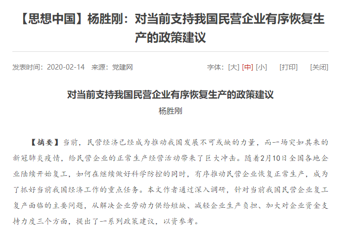 在战疫关键期,杨胜刚老师充分发挥智库平台的作用,敏锐指出在做好疫情防控的同时,“有序恢复生产”的重要性。2月14日,他撰写的《对当前支持我国民营企业有序恢复生产的政策建议》发表在中宣部党建网的思想中国栏目,并被“学习强国”等主流媒体全文转载,引起强烈反响。