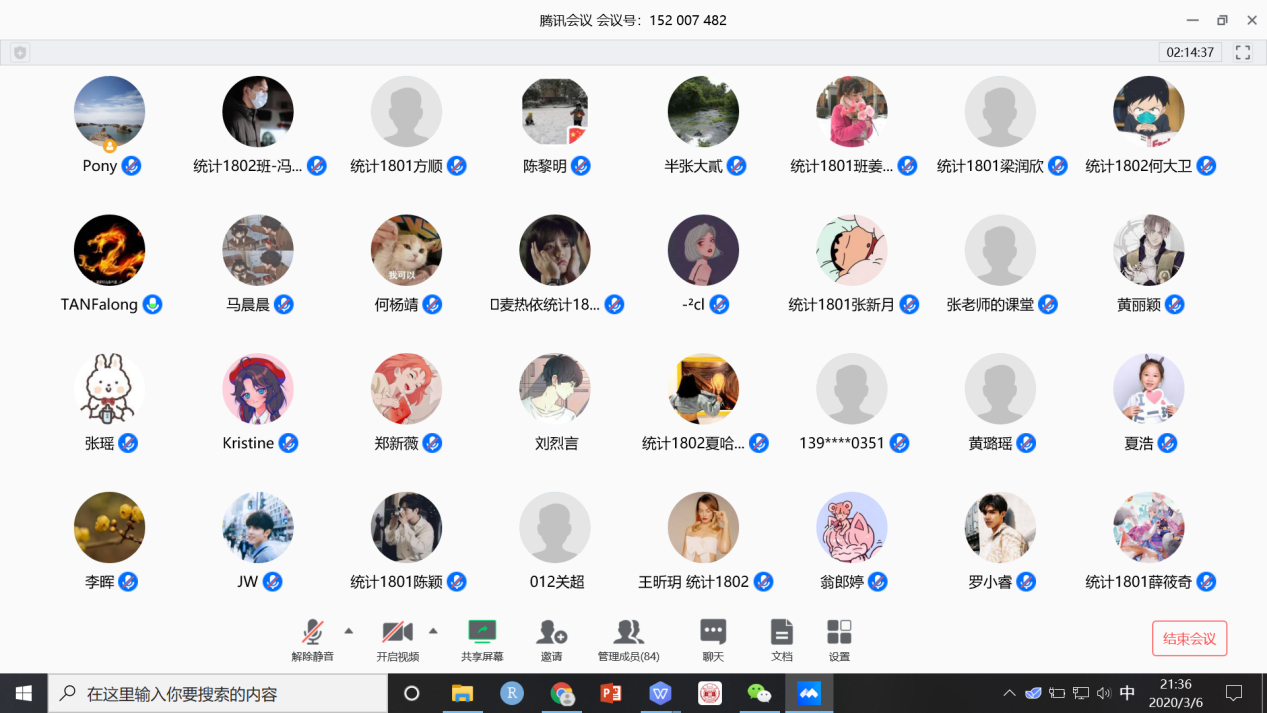 因受新冠肺炎疫情影响,海角 18级统计类学生专业分流宣讲会利用腾讯会议APP在线上召开。3月6日晚上7:30-10:00,统计学系18级全体学生与业界、学界及毕业生代表嘉宾们共聚专业分流线上宣讲会。共有84人参加了线上宣讲会,其中业界嘉宾为湖南省统计局郭文峰处长;学界嘉宾有金统院副院长李海奇,院学科建设办公室主任张立军,院工会主席曾昭法,统计学系党支部书记谭朵朵、系主任谭发龙、副系主任王小燕和马守荣,以及周四军教授、任英华教授、陈黎明副教授和王瑛副教授,18级辅导员夏浩老师和院教务办李晖老师;优秀毕业生代表为18届毕业生祝嘉雪、19届毕业生陈兆阳和黄丽颖。
