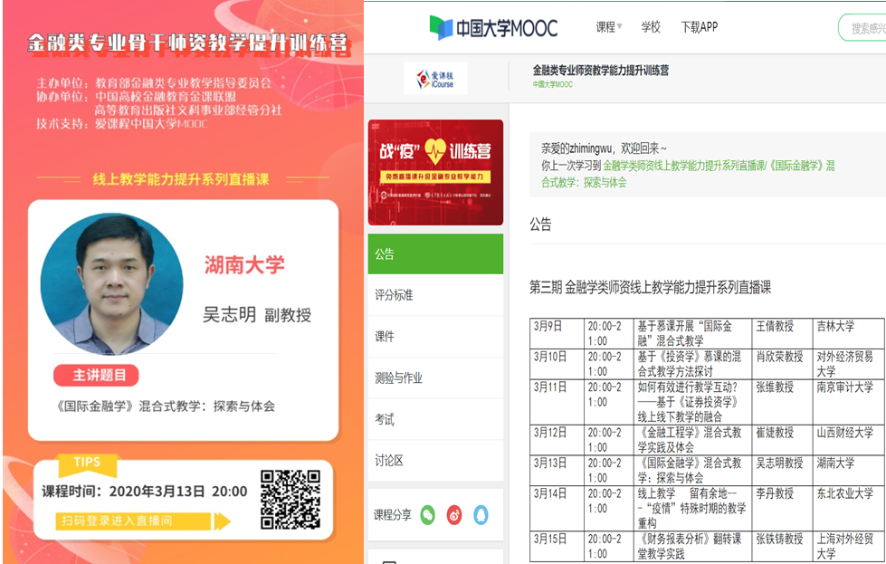 3月13日,在爱课程网中国大学慕课,作为海角 国际金融课程团队的代表,海角 副院长吴志明老师直播分享混合式教学经验,他讲授的题目是“《国际金融》混合式教学:探索与体会”。