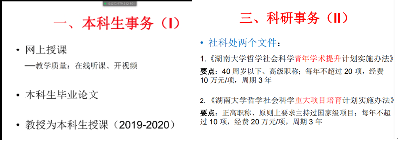会议第三阶段,应用金融系主任马勇老师首先传达了学院党政联席扩大会议关于教学、科研、学生工作的安排部暑,同时结合应用金融系的实际情况和特点,对本科、研究生疫情期间的学生安全、网上教学、长期发展等进行了细致周到地总结。其次,结合教育部关于科研工作的最新文件,对系里的科研目标和定位进行了梳理,并制定了系本年度的工作目标。最后,结合应用金融系的现有学科优势和学科特点,提出系学科发展方向和人才引进方面的思考。各位老师踊跃参与讨论,纷纷为应用金融系的发展献计献策。潘敏院长指出,要真正结合学校、学院发展情况,制定具有前瞻性、可行性的发展规划,明晰学科发展方向,统筹引进人才。王修华副院长强调要提高团队意识,打造科研团队,营造良好的科研氛围,同时要注意打磨高水平专著,提高学科影响力。晏艳阳教授指出这次会议对系里教学、科研等方面有了更清晰的定位,强调了人才布局和团队建设的重要性。戴晓凤教授强调学科发展方向的凝练要兼顾应用系的特色。其他老师对疫情防控、系发展规划等多方面工作各抒己见,提出了很多很好的宝贵建议。