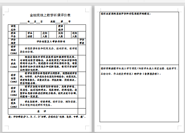 督导组组长张虹老师针对在线教学的特殊性,以原海角 教学听课评价表为基础,设计了金统院线上教学听课评价表,全面客观地评价教师和学生表现。通过督导组微信群,张老师及时发布听课课堂的在线听课链接和二维码,有序组织督导老师对部分老师进行集中督导听课。