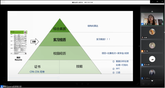 最后为我们进行经验分享的是将要入职平安银行总行的唐静媛同学,她马上将要在平安银行总行数据分析的岗位上工作,作为唯一一个偏技术类岗位的分享嘉宾,她的分享主要是有关于从自己的求职过程中得出的心得体会和介绍了对于技术岗位来说较为有用的技能,最后还给同学们提供了平安银行内推的机会。