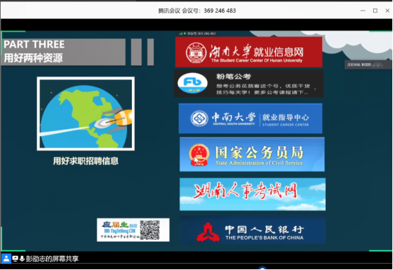 接下来进行经验分享的是将要入职中国人民银行长沙中心支行的彭劭志同学,彭劭志同学作为之前举办的就业交流分享会的组织者和受益者,抱着一颗感恩的心,非常用心地为我们分享了他的有关于考公、银行业的一些自己的看法。整个分享主要包括这几个部分:我的求职经历、定好一个方向、用好两种资源、做好三件事情、分享三句话。