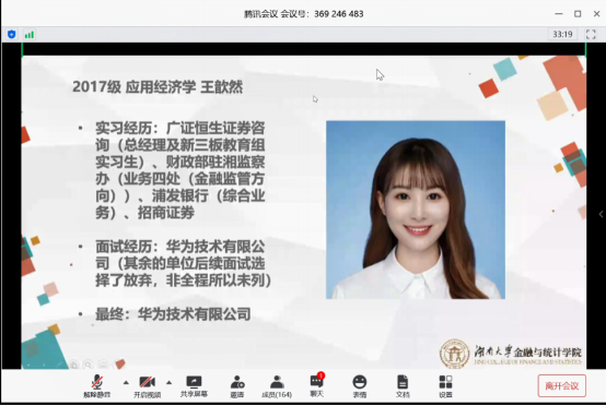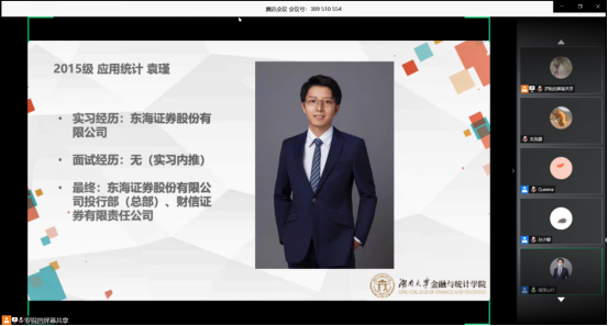 鉴于当前在校部分研究生同学目标不明确,受疫情影响毕业生就业形势不明朗的情况,暑期将至,为帮助同学们 尤其是2021届毕业研究生 更好地利用空闲时间,提升求职技能与职业素质,增强就业竞争力,使同学们明确本专业的就业方向及优劣势,从而合理规划研究生阶段的学习、工作和生活,从根本上有针对性地解决同学们学习和生活目标不明确,就业意识缺乏的问题, 海角 研究生会 于2020年5月30日举办了毕业生线上就业交流分享会活动。本次活动通过腾讯会议平台举办,邀请到了金统院研究生辅导员苏雅倩老师参加本次分享会,也邀请到了15级毕业于应用统计专业的校友袁瑾、17级应用经济学的孙少卿同学、彭劭志同学、郭娜同学、王歆然同学和18级应用统计的唐静媛同学共6位校友和应届毕业生来给我们进行就业分享,并且有共计400余人次的同学参与了本次就业交流分享会。