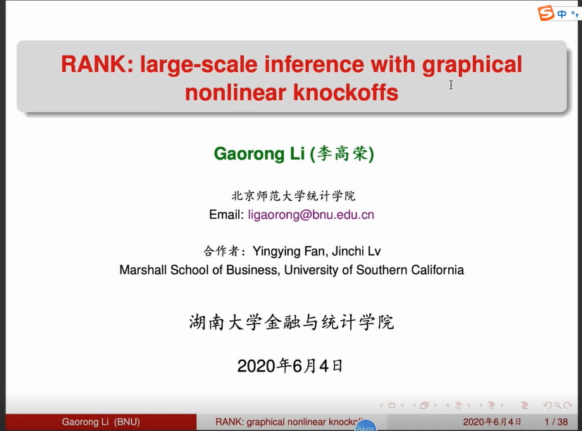 疫情期间海角 的“云上学术”气氛浓郁,2020年6月4 日第254期金融与统计论坛利用腾讯会议线上举行。本次论坛的主题是:具有图非线性防制(konckoffs)的大范围统计推断”,报告人北京师范大学统计学院李高荣教授。此次论坛由海角 统计学系系主任谭发龙副教授主持,海角 教师及硕、博士生踊跃参与此次论坛。