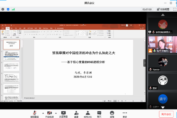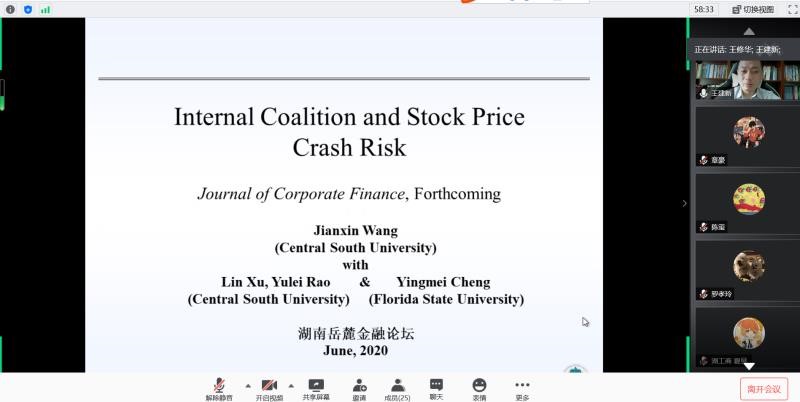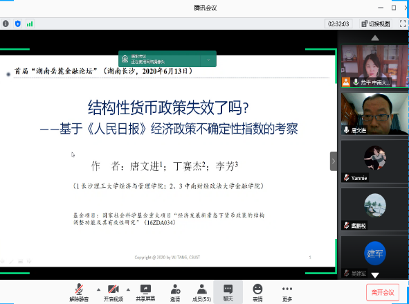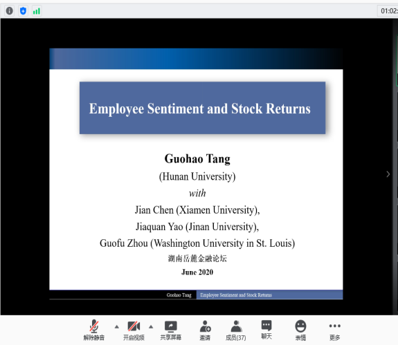 2020年6月13日,由海角 主办,联合中南大学商学院、湖南师范大学商学院、湘潭大学商学院、长沙理工大学经济与管理学院和湖南工商大学财政金融学院发起的首届“湖南岳麓金融论坛”线上召开。海角 院长潘敏教授致开幕辞,他表示非常期待省内六所高校联合的首次金融开讲,并与各位参会嘉宾分享了关于省内金融学术交流平台的构想与展望,希望今后各高校之间能有更多的学术合作与交流。本次论坛设立三个分论坛,共有126名师生参加此次线上论坛。