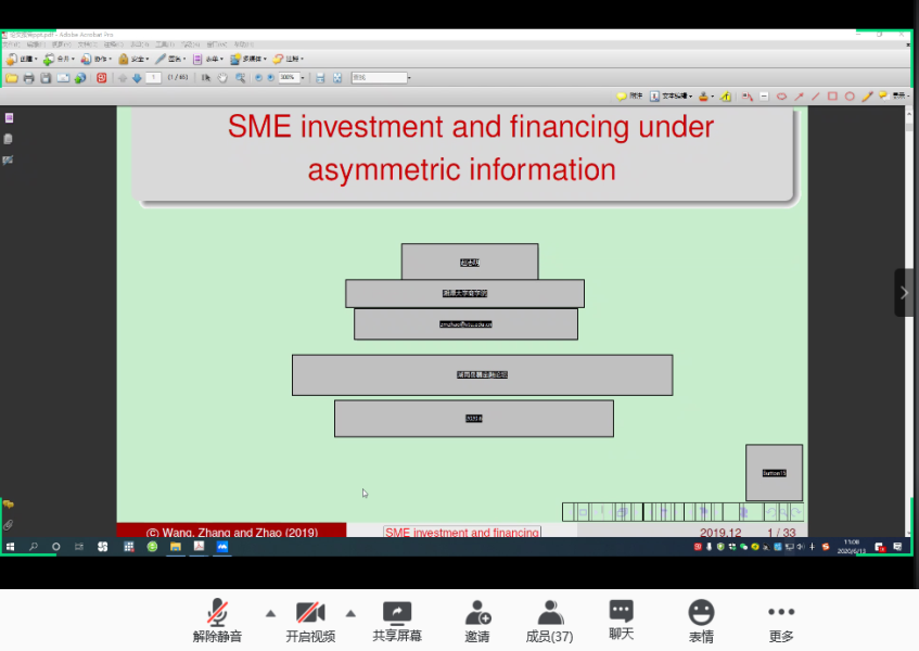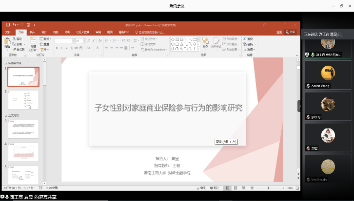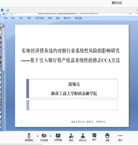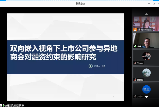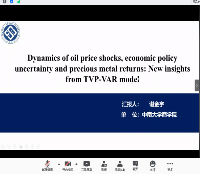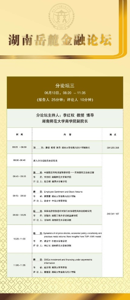 分论坛三由湖南师范大学商学院副院长李红权教授主持,首先由湖南师范大学商学院甘顺利助理教授汇报《中国股票市场财富转移研究——来自股权交易的证据》,本文以2007年第1季度至2019年第4季度中国上市公司股权交易为研究对象,估算了资金空转的收益,并考察了资金空转收益的决定因素;接下来由海角 唐国豪助理教授汇报《Employee Sentiment and Stock Returns》,文章提出了员工情绪指数,作为投资者情绪与经理人情绪的补充,并在样本内和样本外发现了高员工情绪指数能够负向预测未来股票收益;接着湖南工商大学财政金融学院胡锡亮助理教授汇报《实体经济债务违约对银行业系统性风险的影响研究》,本文基于Merton(1974)的标准CCA方法,分析了实体经济债务违约对银行业系统性风险的非线性激增机制,明晰了Nagel & Purnanandam(2020)修正CCA方法嵌入的银行股权与负债“期权的期权”与银行资产收益非线性特征;接下来由中南大学商学院谌金宇副教授汇报《Dynamics of oil price shocks, economic policy uncertainty and precious metal returns: New insights from TVP-VAR model》,基于时变参数矢量自回归(TVP-VAR)模型,研究使用1990年4月至2018年4月的月度数据,着重分析了油价冲击和经济政策不确定性对贵金属收益的动态影响;最后由湘潭大学商学院赵志明助理教授汇报《SMEs investment and financing under asymmetric information》,研究在信息不对称的动态环境中受财务约束的中小企业的投资时机和融资决策。