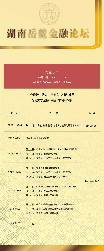 分论坛二由海角 副院长王修华教授主持。首先由长沙理工大学经济与管理学院谢朝华副教授汇报《技术创新的金融发展需求》,认为金融业在结构、功能、效率和安全等四个方面还有较大的发展空间和较强的紧迫性,金融服务技术创新需要练好四大基本功;接下来由湘潭大学商学院许先普副教授汇报《房价波动、金融稳定与最优宏观审慎政策规则》,研究基于植入金融因素的房价波动DSGE模型,分析了不同宏观审慎工具对房价波动的调控效果、作用机制以及最优政策组合等问题;接着由中南大学商学院的王建新副教授汇报论文《Internal coalition and stock price crash risk》,文章检验了内部结盟对2000至2014年间股票崩溃风险的影响,基于任命的内部结盟对股票崩溃风险有正向和重大影响;最后由湖南工商大学财政金融学院王韧教授汇报论文《子女性别对家庭商业保险行为的影响研究》,本文运用Probit和Tobit回归的方法,利用2013年、2015年及2017年三年中国家庭金融调查截面数据研究了家庭对于商业保险投资在一定程度上存在对子女的性别偏好的问题。