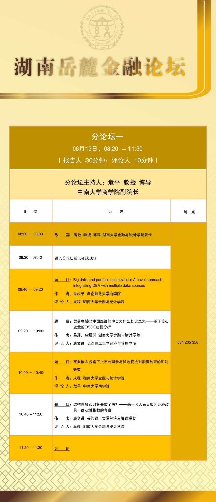 分论坛一由中南大学商学院副院长危平教授主持。首先是湖南师范大学商学院的肖和录助理教授汇报论文《Big data and portfolio optimization: A novel approach integrating DEA with multiple data sources》,通过对大数据和投资组合优化,介绍了一种将DEA与多源数据集成的新颖方法;接下来由海角 马理教授汇报《贸易摩擦对中国经济的冲击为什么如此之大——基于信心变量的DSGE建模分析》,研究构建了开放经济条件下的DSGE模型,论证信心变量在贸易摩擦传导过程中的重要作用;接下来由海角 成程助理教授汇报《双向嵌入视角下上市公司参与异地商会对融资约束的影响研究》,通过分析异地商会双向嵌入的社会属性和现实功能出发,将2008—2018上市公司高管向异地商会捐款和担任异地商会职务的数据与上市公司财务数据进行匹配,验证上市公司参加商会对公司融资约束的影响。最后由长沙理工大学经济与管理学院唐文进教授汇报《结构性货币政策失效了吗?——基于人民日报经济政策不确定性指数的考察》,本文从企业杠杆率视角,利用人民日报经济政策不确定性指数以及2013年第一季度至2019年第二季度A股上市公司及宏观经济的匹配数据探究其原因,发现结构性货币政策依然有效,但经济政策不确定性对结构性货币政策的实施效果由于信心渠道产生了较大干扰。
