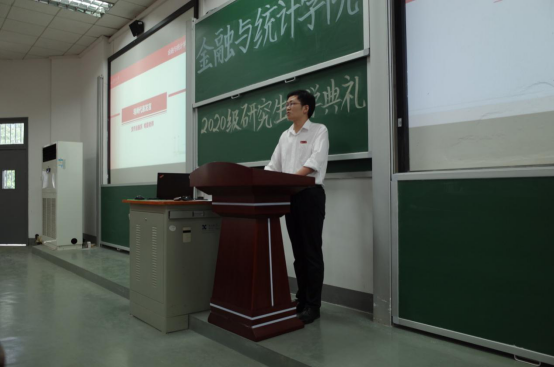 指导教师代表货币金融系明雷老师发言,希望同学们畅通德才“双循环”,自觉成长为德才兼备的研究型人才。