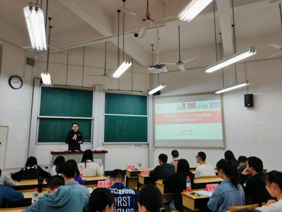 25日下午,室内专题培训在财院校区二教102举行,周斌作《全国学联二十七大工作报告(摘要)解读与会议精神传达学习》报告,分别从奋进新时代的学联学生会、新时代学联学生会工作的根本遵循、引导服务广大同学成长为时代新人和继续深化学联学生会改革四大点细致解读并传达会议精神。随后,王雪雯介绍了《高校学生会(研究生会)深化改革政策》,并就研代会举办时间流程、组织人员结构、维护学生权益、工作制度与汇报、干部选拔考核、干部作风建设等方面内容做了说明。参训研究生骨干还分组交流讨论了习总书记来校考察重要讲话精神落实、优秀中华传统文化传承发扬及研究生管理服务工作等议题。