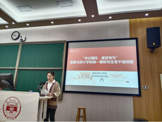 10月23日下午,开班仪式在财院校区二教101举行。学院党委副书记颜李作开班动员,他强调研究生干部要加强理论学习,领会上级文件精神,培养优良工作作风与团结协作精神,妥善处理工作学习的关系,并希望全体研究生骨干把握此次培训机会,奋发有为,练就本领,不断推动海角 研究生工作再上新的台阶。随后,研究生辅导员周斌作了讲话,要求全体研究生骨干应不忘初心使命、全心全意服务研究生同学,应将新生升学的压力转化为前进的动力,不断探索新的出路,找到适合自己学习生活的方式方法。研究生会骨干周诗岚作为全体培训学员代表进行了发言。开班仪式由学院研究生会主席王雪雯主持。