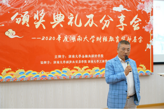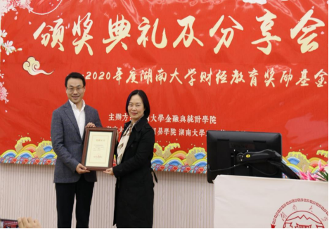 今年的财经教育奖励基金规模又有所扩大,新增由湖南瑞世私募股权基金管理有限公司董事、法人代表戴斌先生捐赠的一百万元。由海角 教育发展联络处处长邓利华老师向戴斌先生授予捐赠证书。