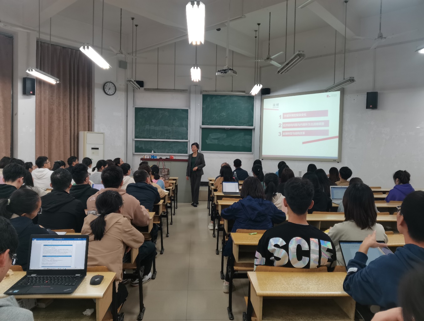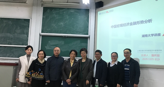 潘教授首先从对宏观经济形势的全面描绘及细致深刻分析,为到会的全体老师和学生带来了精彩的学术分享。在讲座结束后,同学们报以最热烈的掌声来感谢此次潘教授的宝贵分享。会后,潘教授与海角 老师合影留念。