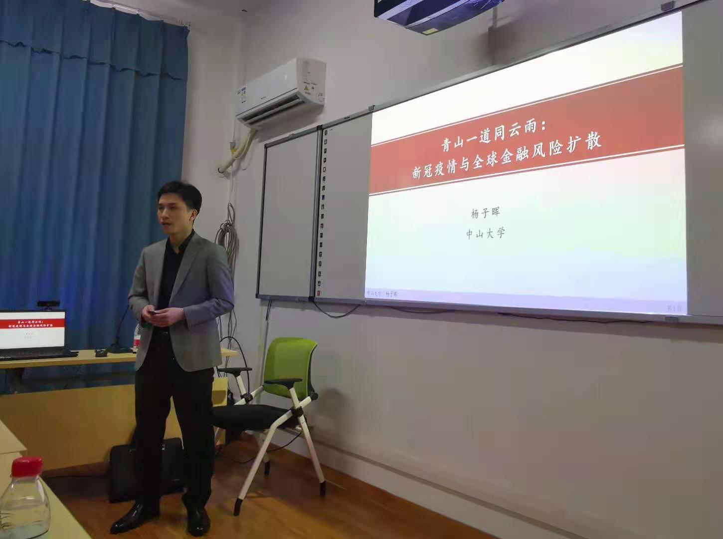 2021年3月26日下午,中山大学岭南学院杨子晖教授应邀来访海角 ,并做题为“青山一道同云雨:新冠疫情与全球金融风险扩散”的学术讲座。讲座由海角 马理教授主持,喻旭兰教授、梁巨方副教授、明雷副教授、赵静助理教授、赵丽娟助理教授、岳崴助理教授,以及部分博士生和硕士生参加了此次讲座,现场座无虚席,讲座受到了同学们的热烈关注与积极响应。