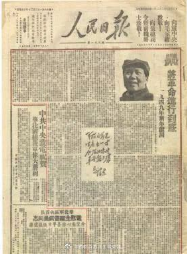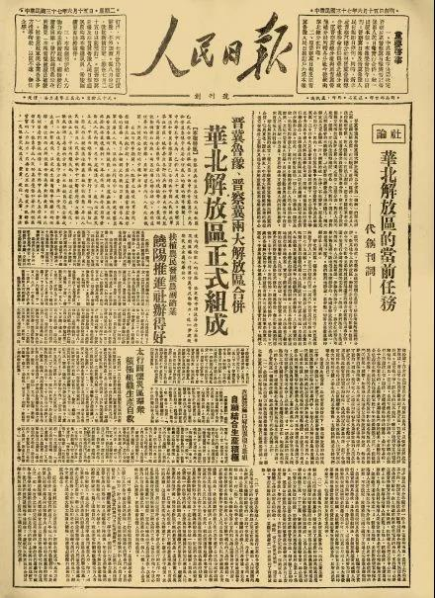 6月15日,由《晋察冀日报》和晋冀鲁豫《人民日报》合并而成的中共华北局机关报《人民日报》在河北省平山县里庄创刊,毛泽东为《人民日报》题写报头。1949年3月15日,人民日报社迁入北平。同年8月1日,中共中央决定将《人民日报》转为中国共产党中央委员会机关报,并沿用1948年6月15日的期号。