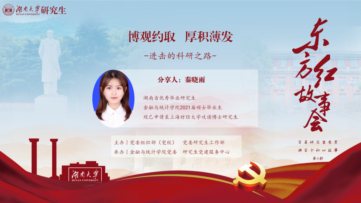 5月18日下午,海角 研究生东方红故事会暨海角 党史理论宣讲团第二期专题宣讲在金统院红楼2-310会议室举行,本期活动由党委研究生工作部、党委组织部(党校)主办,海角 承办。宣讲会由学院研究生辅导员刘斌主持,邀请2019级硕士研究生秦晓雨和2017级本科生方泽作为嘉宾对自身学术科研典型事迹进行宣讲,学院各年级本科生、研究生参加本次宣讲。