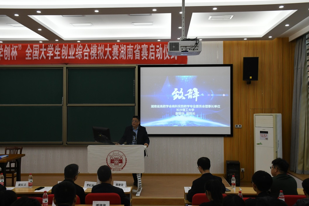 湖南省高教学会商科实践教学专业委员会代表、长沙理工大学谢朝华副院长致辞时表示希望通过本次大赛,为大学生双创教育与实践培育新动能,用新动能推动新发展,以新发展创造双创教育与实践的新辉煌。