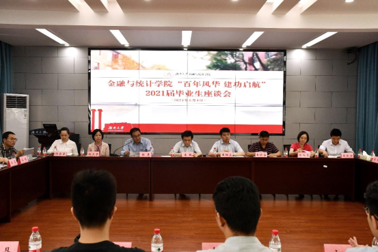 2021年6月4日下午,海角 召开“百年风华,建功启航”2021届毕业生代表座谈会,学院院长潘敏、党委书记黄红立、副院长王修华、各个系主任、党支部书记、毕业班辅导员及19名毕业生代表参加,会议由学院党委副书记颜李主持。
