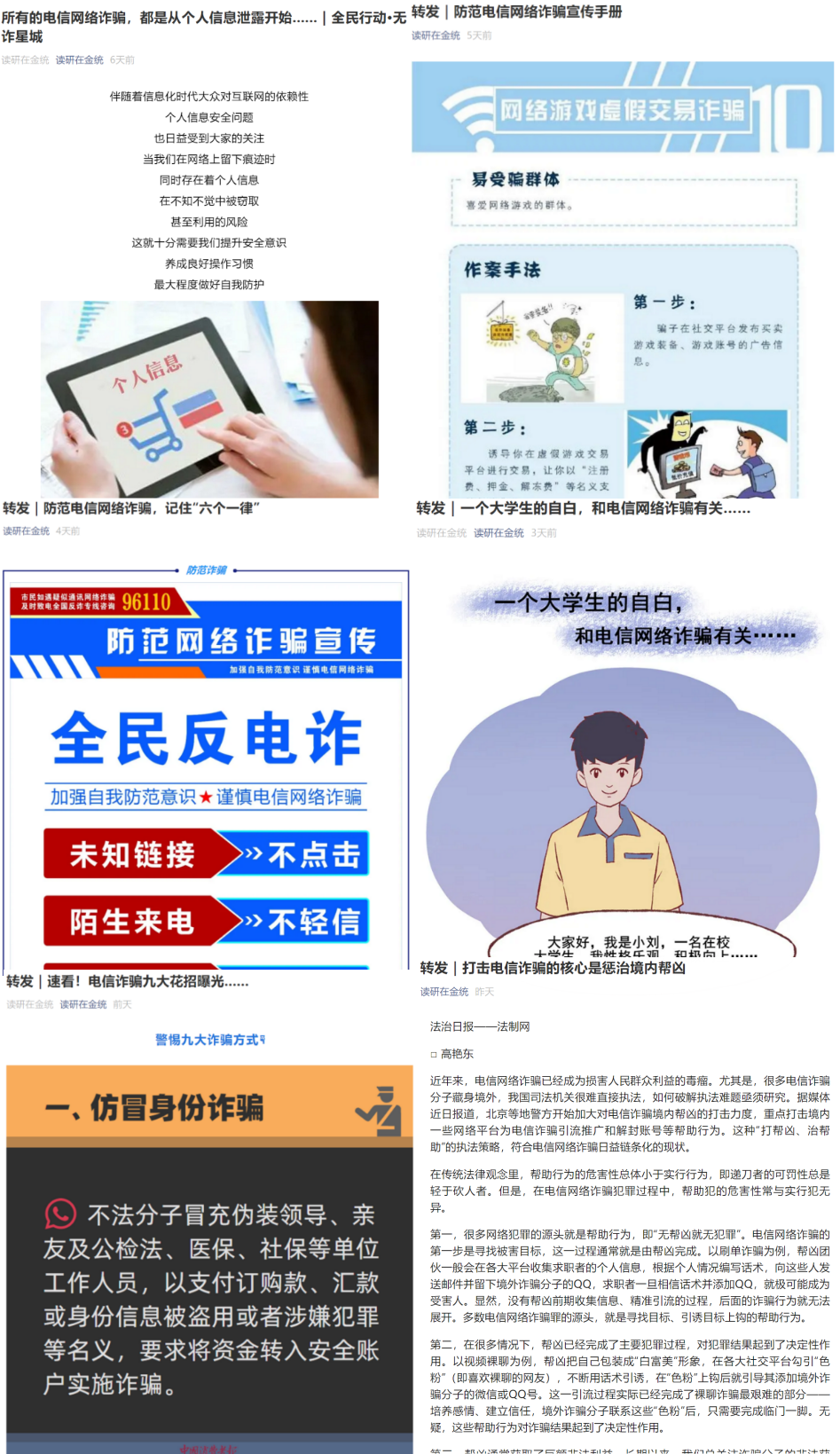 活动期间,学院利用QQ、微信等社交平台扩大宣传教育范围,巩固线下宣传成果,拓宽防范教育的覆盖面。“读研在金统”微信公众号积极转发最高人民检察院、人民网、长沙公安、中国消费者报、法制网等官方账号的宣传推送,涵盖隐私信息泄露途径、电信网络诈骗的方式与应对措施等内容,起到划重点、提要领的作用。