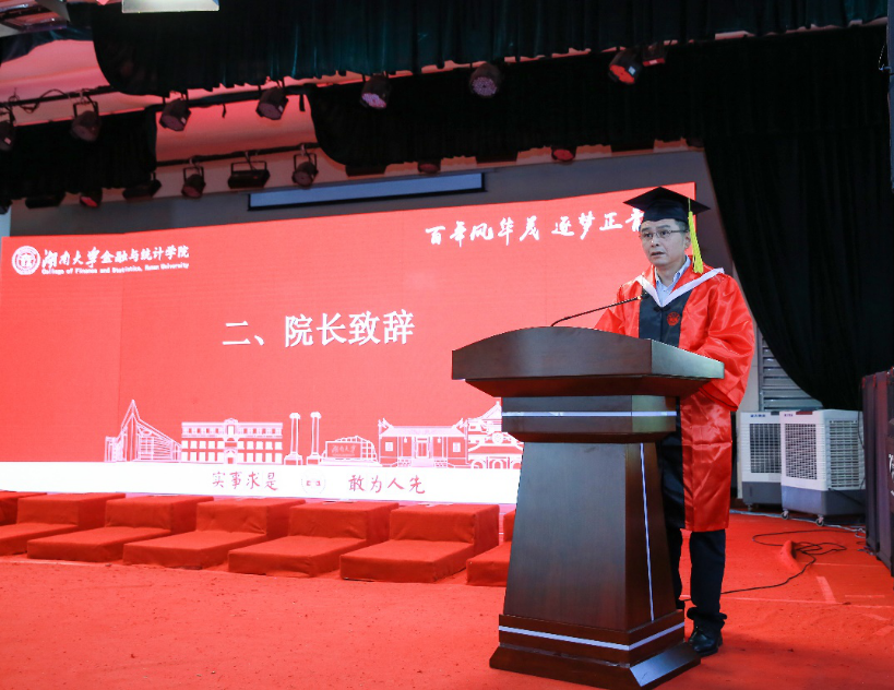潘敏作题为《开拓、传承、感恩》的讲话。他首先代表学院向毕业生表示最热烈的祝贺并致以最美好的祝愿,并对毕业生提出三点期望:第一,勇于担当,做新时代的开拓者;第二,勇立潮头,做金融黄埔的传承者;第三,永远学习,做新时代生活的感恩者。他希望同学们秉持“实事求是,敢为人先”的湖大精神,去品味人生百味的感悟和感动,去收获更多的成功和幸福。衷心祝福大家鹏程万里,万事胜意!