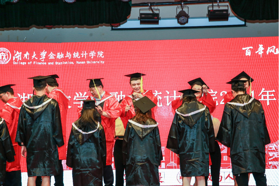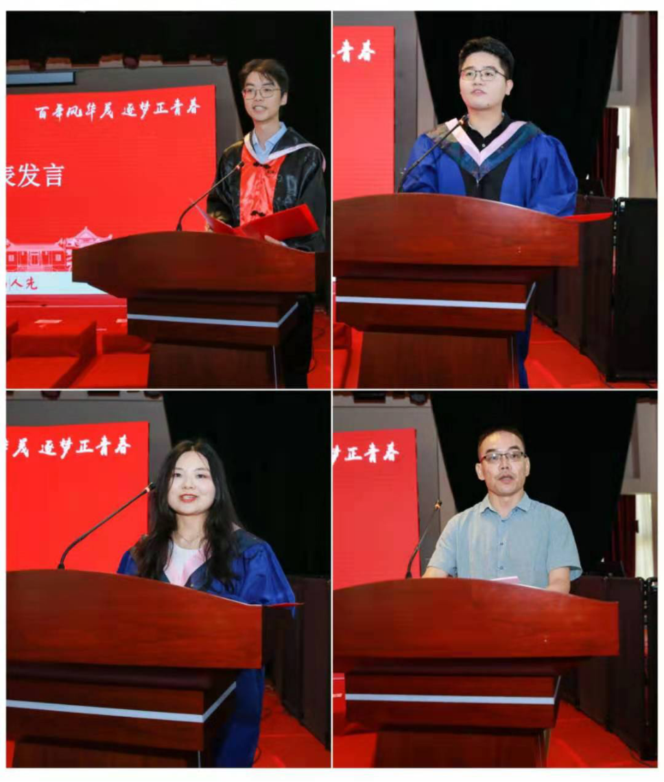 2021届毕业本科生代表李杞仁、2020届毕业研究生代表彭劭志、2021届毕业研究生代表的洪俊敏、金融1707班谢慧文家长依次发言,怀念湖大金统的青春岁月,感恩金融黄埔的悉心培养和热心帮助。