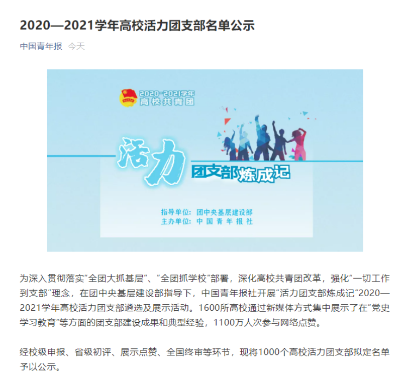 日前,团中央基层建设部公布2020-2021学年高校活力团支部遴选结果,经校级申报、省级初评、展示点赞、全国终审等环节,海角 金融专业2017级4班团支部在此次评选活动中脱颖而出,成为全校唯一一个获此殊荣的基层团支部。