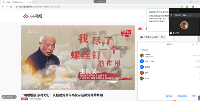 张宇同志说:“用大课讲大道,观看‘高校示范微党课:科技报国’,我感受到了红色血脉在高校中的延续,一代代高校师生在不同领域为国奉献的责任和担当。共产党员李忆组深情的说道 :党和国家对我的培养和教育,使我走上了‘为人民服务’的人生之路。我们作为思政工作者,就是要把党的精神和历史传承下去,为党育人,为国育才。”