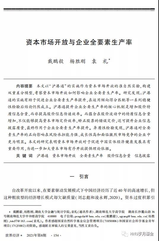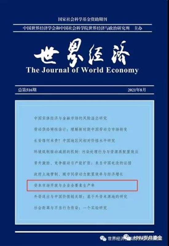 近日,由海角 2019级博士生戴鹏毅与杨胜刚教授作为共同第一作者、湖南师范大学袁礼副教授作为通讯作者合作完成的论文《资本市场开放与企业全要素生产率》发表在《世界经济》2021年第8期,该期刊是校定A2期刊。