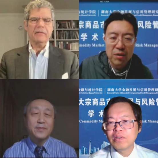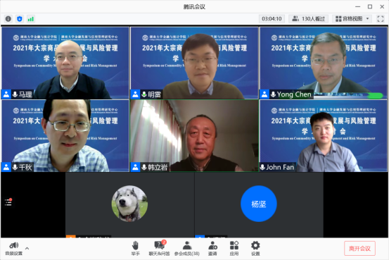 随后,五位学者以“后疫情时代的大宗商品”为主题开展了圆桌讨论。讨论由北京航空航天大学韩立岩教授主持,来自Texas A&M University的陈勇教授、University of Hawaii的刘千秋教授、Griffith University的樊华教授和海角 的马理教授等参与了讨论。本次讨论首先从通货膨胀和货币政策的角度探讨了外部冲击对大宗商品市场的影响。之后各位专家将视角由宏观转向微观,探讨了大宗商品价格上涨对小微企业的影响。最后,基于以上讨论,与会专家进一步探讨了大宗商品市场的发展趋势,提出了仍待解决的问题,并针对上述问题提供了针对性的政策建议。