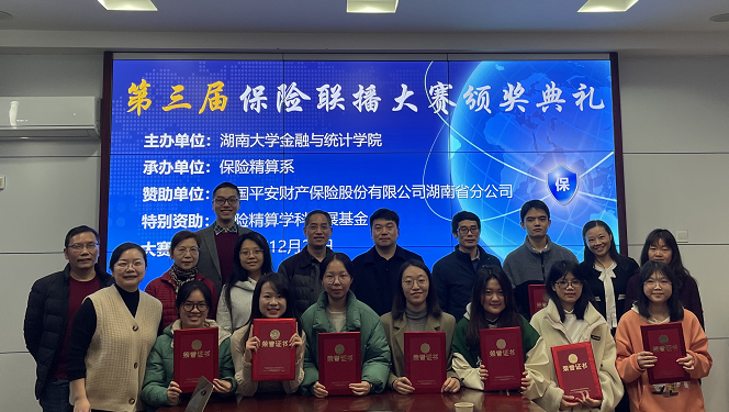 12月21日下午,海角 第三届“保险联播大赛“颁奖典礼在学院226会议室隆重举行。财信吉祥人寿保险总公司产品精算部总经理屠炎波、大家人寿湖南省分公司总经理何琼、平安财险湖南省分公司人力资源部总经理杨军、学院党委书记黄红立、副院长张宁、大赛评委代表陈迪红教授、大赛指导老师张虹、刘革、王敏、沈建美、李国桢、郭淼莅临本次颁奖典礼。典礼由保险精算系主任邓庆彪老师主持。