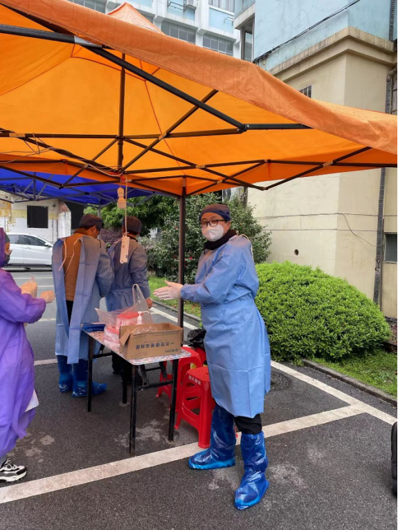 张琳教授不仅是一名教师,也是一名人大代表、政协委员,平时课程多,任务重。当得知学校需要志愿者支持抗疫工作时,她第一时间报名参加。当天,张老师被分配到龙王港园区协助做核酸检测,这是个细致的工作。她穿着防护服,进行核酸检测前的各种准备,并且两人一组负责健康码录入和分发棉签,督促学生们扫二维码,提醒学生们保持间距等。