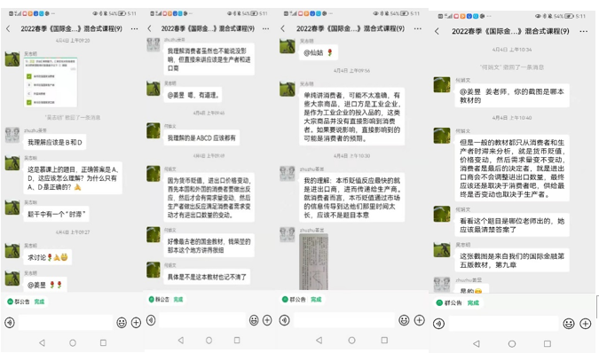 课程团队的姜昱、刘晓剑、叶敏和杨晓临老师同样精心设计线上课堂教学方案,同时辅以在中国大学慕课SPOC讨论区在线发布主题讨论、讨论区和课程群答疑、串讲和课堂小测作业等多种教学形式,与学生即时互动,在疫情冲击无法面授的情况下确保线上教学不掉钱,实现与线下课堂同质等效的教学效果。