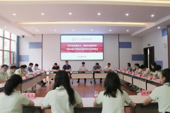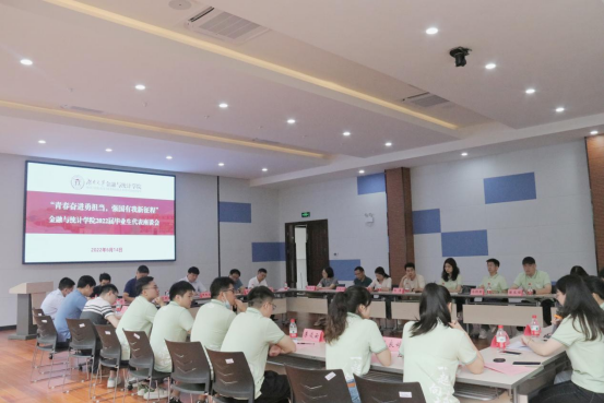 6月14日上午,海角 在财院校区报告厅召开“青春奋进勇担当,强国有我新征程”2022届毕业生代表座谈会。学院党委书记黄红立,党委副书记、纪委书记颜李,副院长吴志明、王修华、张宁出席会议。各教学系主任、毕业班辅导员及17名本研毕业生代表参加座谈会。会议由学院团委书记周斌主持。