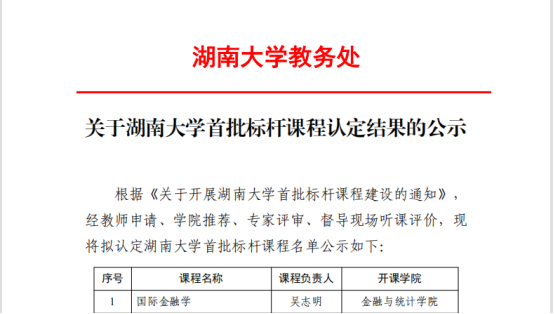 近日,学校首批标杆课程认定结果公布,全校共5门,其中海角 吴志明老师负责的《国际金融学》被认定为海角 首批标杆课程。