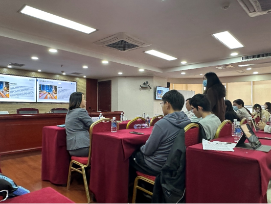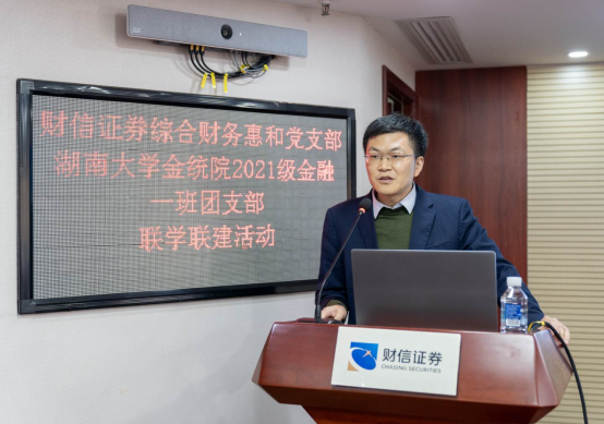 财信证券公司工作人员滕毅带领大家参观完公司后,在26层会议室,明雷副教授为财信证券综合财务惠和党支部党员和海角 金融2101班团支部学生解读了二十大报告。他围绕十六大至二十大近五次党代会报告整体比较、构建新发展格局以及十年来我国金融实践三个方面对二十大报告进行系统阐述和解读,明雷老师分享了自己的学习认识和体会。从”统筹安全与发展”到“科技赋能金融”,从“进一步解决统一大市场下的市场分割”到“产业转移中的金融参与”,从“健全宏观经济治理体系”到“健全现代预算制度”,从“深化金融体制改革”到“强化金融稳定保障体系”……从自身的经历出发,深入浅出,以历史比较分析的视角简述了自己对二十大报告的理解,得到了业内人士和在场同学的一致好评。