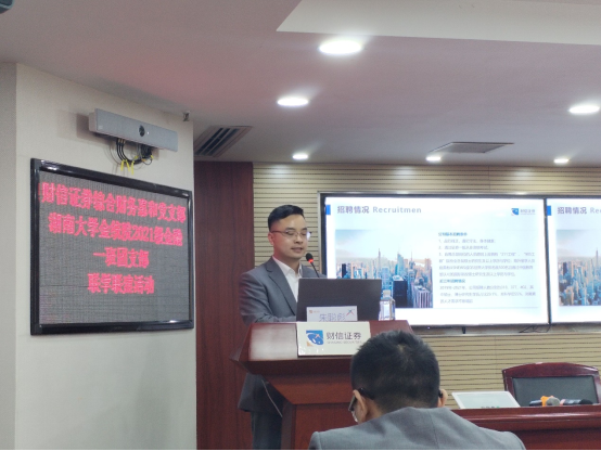 随后,财信证券综合财务惠和党支部书记朱聪彪为同学们讲解了金融行业当下就业形势以及从业人员需要具备的技能和素养,介绍了财信证券公司和招聘基本情况。朱聪彪书记曾在海角 担任辅导员,他清楚地知道同学们的所求与所需。他的发言很好地解决了同学们心中的困惑,消除了同学们心中的迷茫。