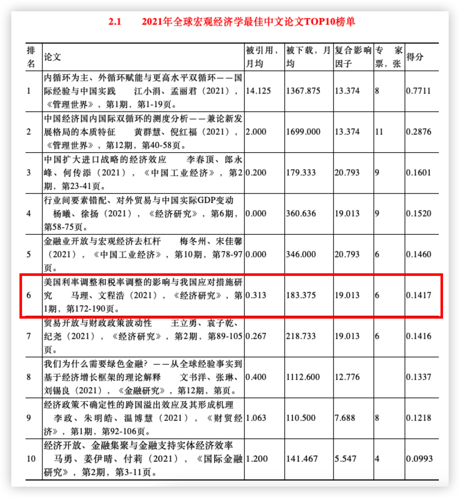 近日,《世界经济年鉴》编辑部组织评选的2021年世界经济学“最佳论文TOP10”榜单揭晓,海角 马理教授与其指导博士生文程浩在《经济研究》合作撰写的论文《美国利率调整和税率调整的影响与我国应对措施研究》,入选“全球宏观经济学2021年最佳中文论文TOP10”榜单。