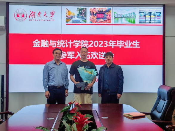 黄红立书记首先向王子帆同学表示祝贺,并表示应征入伍是你本人、家庭和学校、学院共同的光荣。他希望子帆同学入伍后继续加强学习、不断提升自己,磨炼意志品质,深植家国情怀,矢志报效祖国,不负青春不负韶华,不辜负学校和祖国的期望。