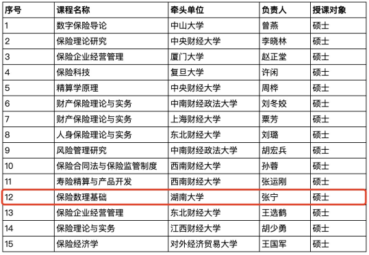 近日,全国保险专业学位研究生教育指导委员会公布了2023年全国保险专业学位研究生在线示范课程计划建设团队评选结果。经过评审,来自全国11个培养单位的15个课程教学团队入选,其中,海角 张宁教授负责的《保险数理基础》课程教学团队入选。