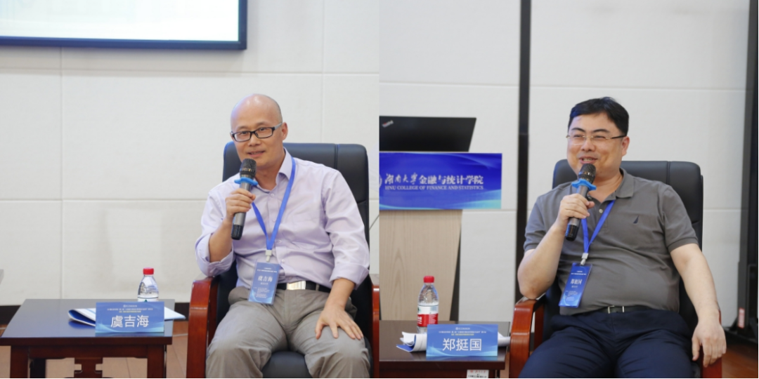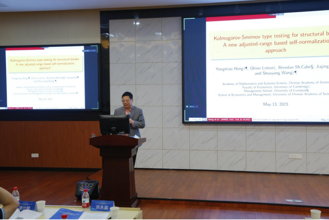 本次研讨会共有三个时段的七场特邀报告和一场青年学者圆桌论坛。第一时段特邀报告由海角 副院长李海奇教授主持。中国科学院大学洪永淼教授和清华大学苏良军教授分别作了主旨演讲。洪永淼教授针对结构变点检验问题、基于极差提出了一种新的Kolmogorov-Smirnov型检验统计量,能够缓解现有Kolmogorov-Smirnov检验统计量中的检验势损失(power loss)问题。洪永淼教授生动形象地解释了其提出的新检验背后的经济直觉,并对其理论性质进行了深入探讨。苏良军教授从因子模型出发,考虑了因子载荷的时变特征。他指出直接应用sieve主成分分析方法存在识别问题,并为解决这一问题提出了基于sieve方法的两阶段估计方法。首先,利用核范数正则化方法获得因子与因子载荷的初步一致估计。其次,通过迭代对偶最小二乘方法估计因子与因子载荷。最后,苏良军教授详细阐述了基于sieve方法两阶段估计的理论性质。