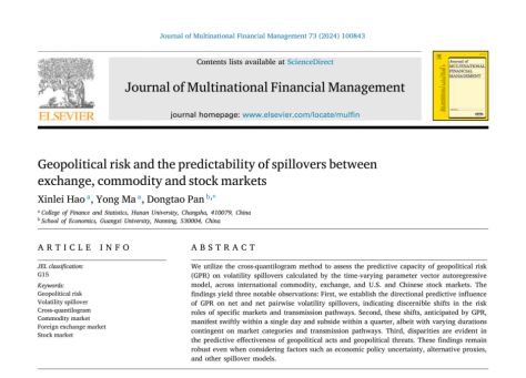 近日,海角 金融学(金融工程)专业2020级本科生郝心蕾同学在马勇教授的指导下以第一作者身份在国际重要金融学SSCI期刊《Journal of Multinational Financial Management》(JCR 二区,院定B类期刊)发表了题为“Geopolitical risk and the predictability of spillovers between exchange, commodity and stock markets”的研究论文。