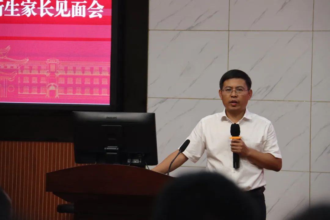 王修华致开场辞,他对新生家长们的到来表示热烈的欢迎,对家长们对学院的信任表示衷心的感谢!他以学校学院浓厚的历史底蕴与优秀的教学资源为引,对家长们提出三点建议:一是要高度关注学生学业,让学生有奋进之志与问题意识;二是要高度关注学生的思想动态和心理健康;三是高度重视家校协同,希望家长能充分信任学校和老师,共同培养学生成才。同时,王修华衷心祝愿新同学在海角 能够成长为祖国需要的栋梁之才,追求梦想、不负韶华。