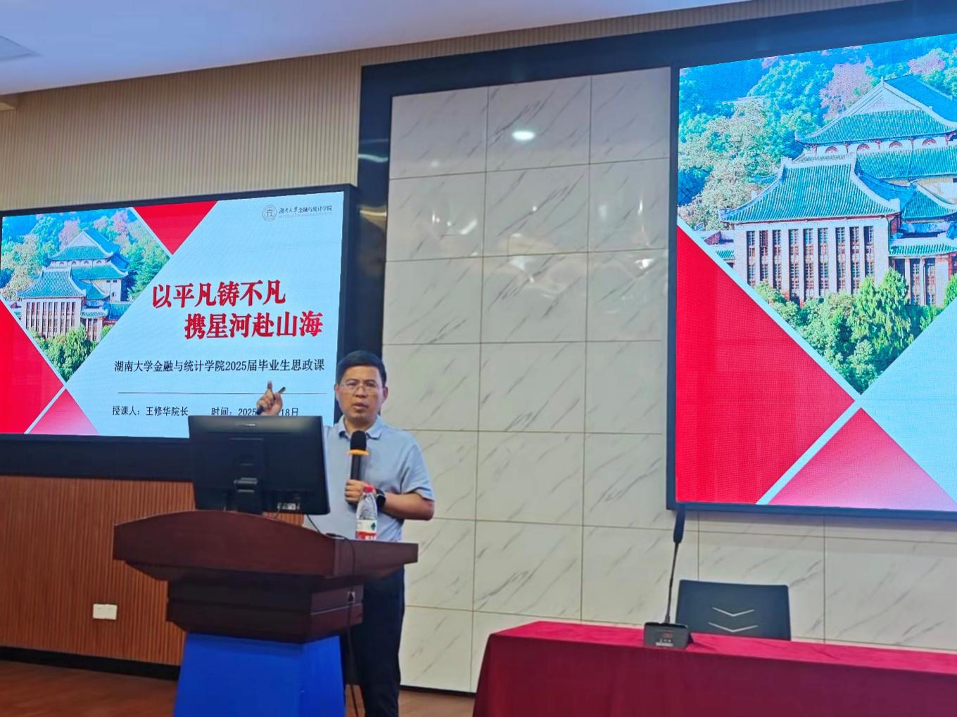 王修华最后围绕“前路灿烂:学成报国正当时”指出,当前正是中国式现代化全面推进的关键时期,金融强国战略的提出,为同学们提供了前所未有的广阔舞台。金统学子要以“学成报国正当时”为引领,自觉将个人理想融入党和国家事业;要主动对接国家战略需求,勇担时代重任;要将青春智慧倾注于解决国家发展的真问题、大问题,以湖大人特有的实干精神服务国家战略需求。