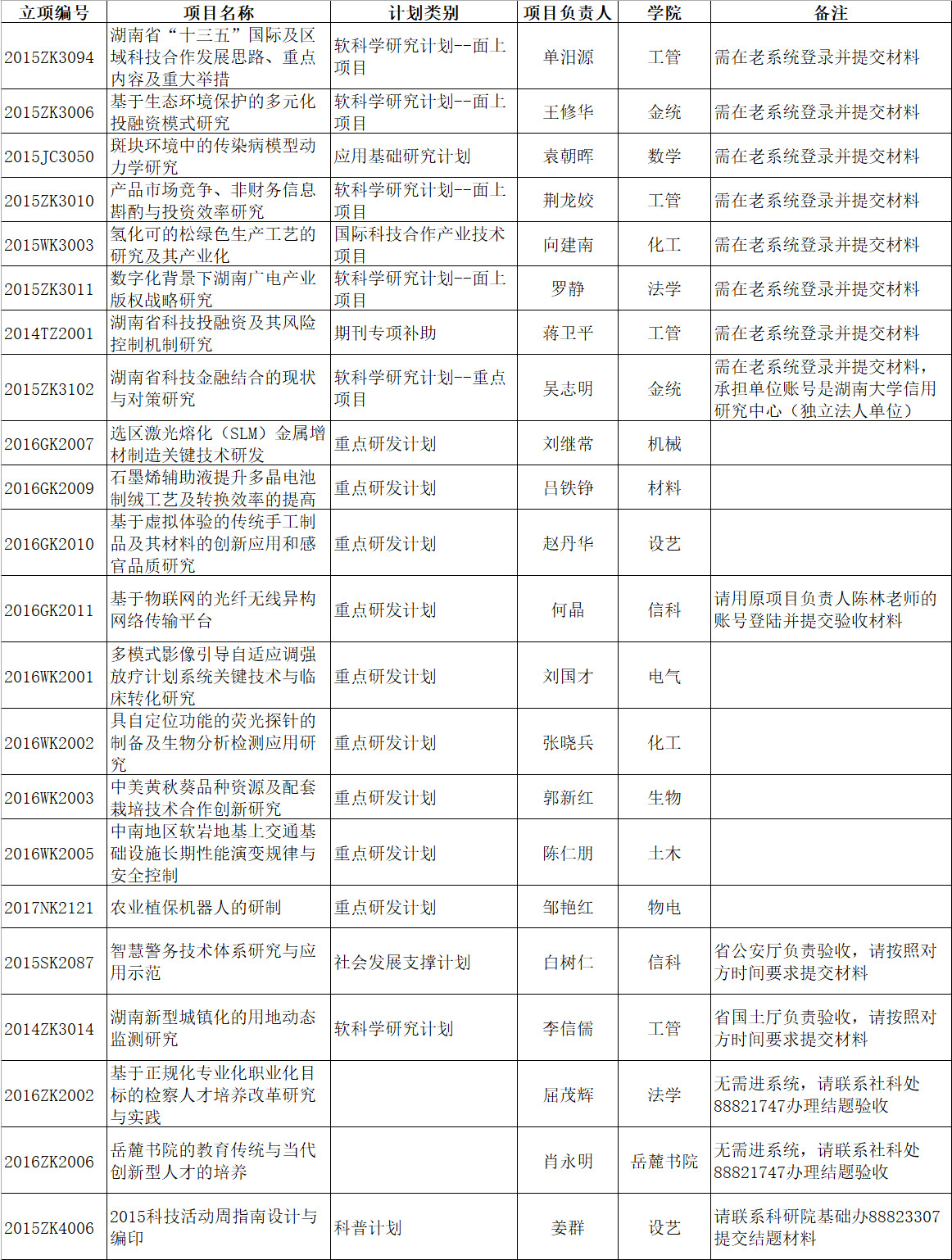 根据湖南省科学技术厅2018年7月发布的《关于开展2018年度湖南省科技创新计划验收工作的通知》(见附件1)、《中共中央办公厅国务院办公厅关于深化项目评审、人才评价、机构评估改革的意见》和《湖南省科技发展计划专项资金管理办法》等文件要求,现开展我校本年度湖南省科技创新计划项目的结题验收工作,有关事项通知如下: