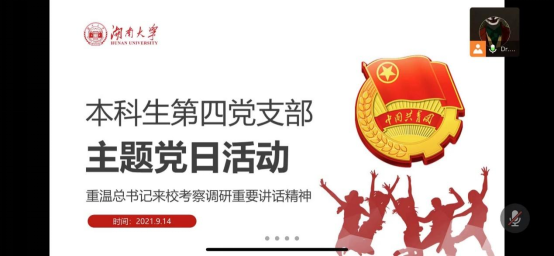 9月14日,海角 本科生第四党支部由支部副书记姚飞宇同志在线上组织召开“牢记嘱托,矢志一流”暨党史宣讲主题党日活动,带领支部党员重温总书记在湖大考察讲话系列精神以及从党史学习教育中吸取知识及力量。在总书记来我校考察一周年及建党百年之际带领同志们重温总书记嘱托不负时代的重托,继续传承湖湘精神,经世致用,为中华民族伟大复兴贡献所有才智。
