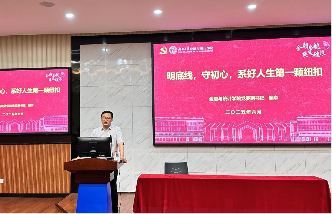 6月18日,海角 “明底线,守初心,系好人生第一颗纽扣”2025届毕业生党员党课在财院校区老食堂二楼报告厅举行,本次党课由学院党委副书记颜李老师主讲,毕业班辅导员王婕妤、张宇、全体毕业生党员参加。