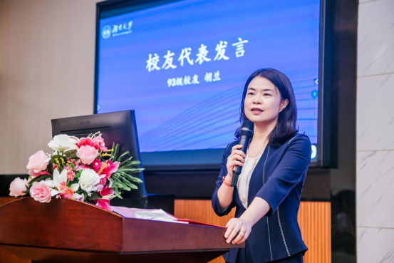 国泰君安证券湖南分公司总经理,93级校友代表胡兰发言。她表达了对学校和辅导员谢君老师悉心栽培的感激之情,表示自己时刻有一份回报母校的情怀,并结合亲身经历提议加强校企互动,鼓励同学们不断拼搏,迈向更好的平台。